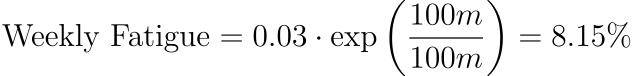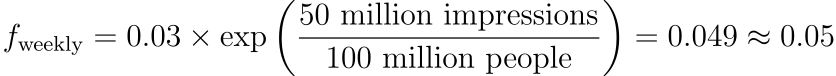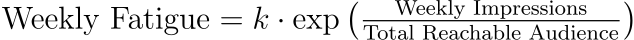 Where exp is the exponential function, k is a constant that we can empirically compute to be around 0.03 based on our client analysis. For example, say you have a generic fitness product. Your addressable audience in the U.S. is roughly 100 million people who care about fitness. Assuming a normal CPM of 10, if you spend $1M per week, your weekly fatigue rate would be: