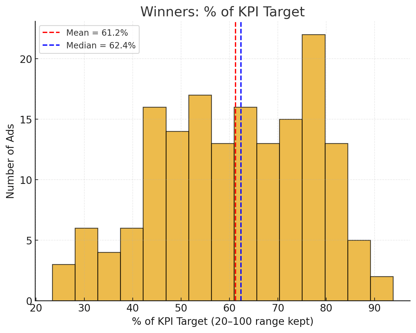 Ignore the left tail end, as most of those ads were just accounts that had a really bad starting point. Excluding the tail gives ~70%. So even after the 25% scale fatigue, we’re looking at something that’s beating KPI by a decent bit