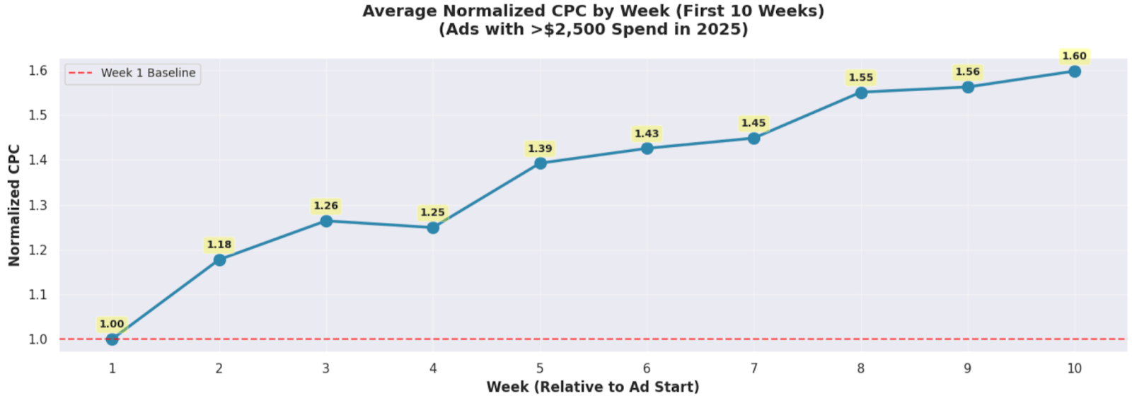Back to fatigue. For ad accounts at scale, we see ads fatigue 10-20% week over week due to high frequencies. At small scales, ads can last months if not years while keeping decent CACs. Fatigue climbs exponentially with frequency (for software/app advertisers, 2.5+ in a week is usually when things get bad).